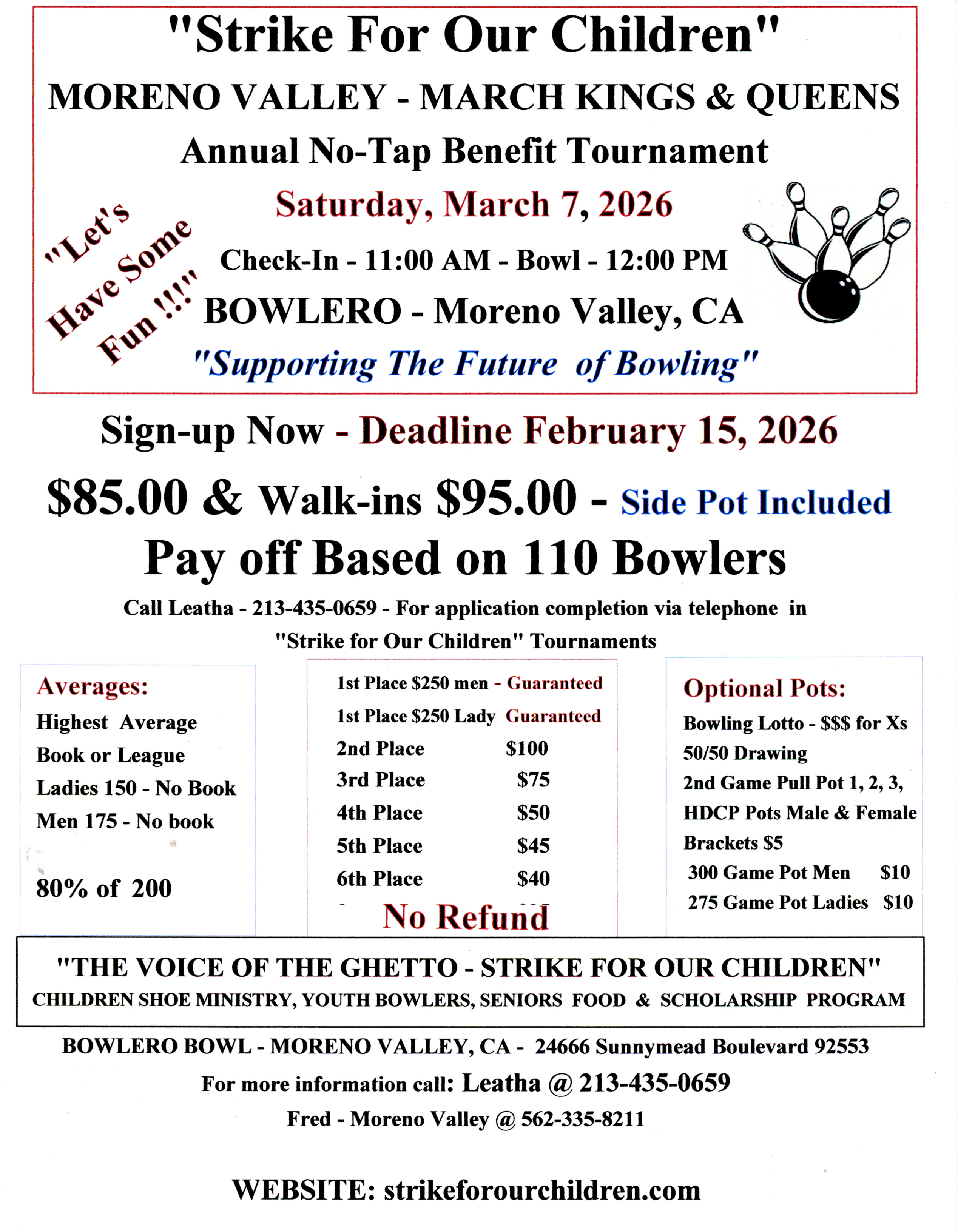 The Voice of the Ghetto Ministries is sponsoring the annual STRIKE FOR OUR CHILDREN NO TAP BENIFIT TOURNAMENT